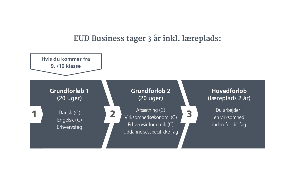 Kort fortalt er EUD Business den klassiske vej til en uddannelse inden for butik eller handel. Du skal først i skole i 1 år (grundforløb 1 og 2) og derefter får du en 2-årige læreplads i en virksomhed (hovedforløbet).