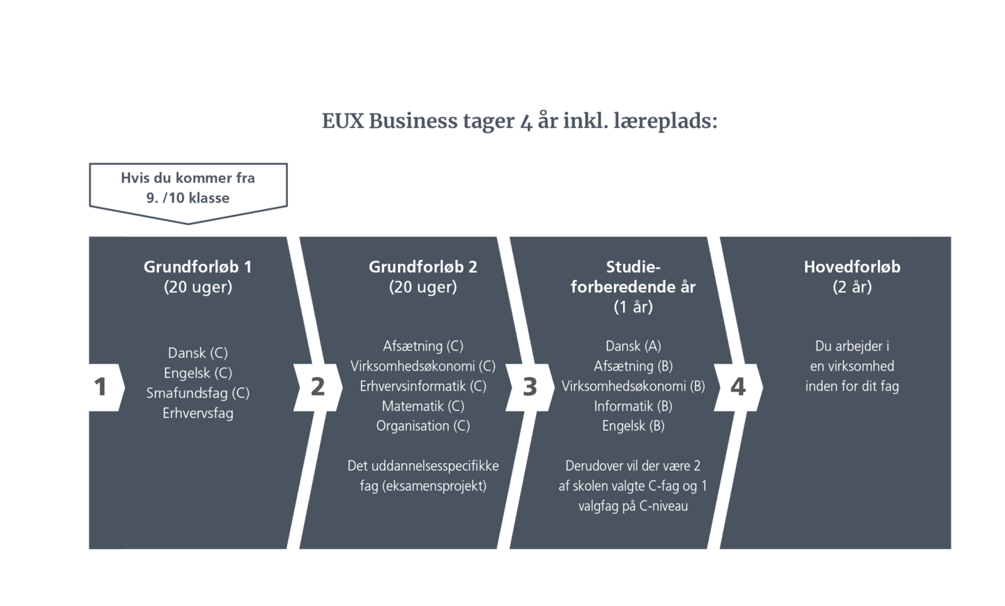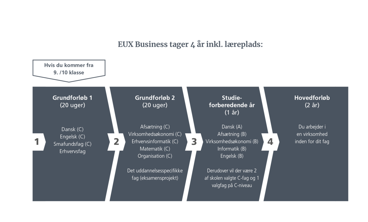 Med en EUX Business har du alle kort på hånden til at gøre karriere i erhvervslivet eller starte på en videregående uddannelse. På EUC Nord kan du vælge mellem 4 forskellige hovedforløb, som alle tager to år. Dem kan du begynde på efter du har afsluttet de to første år, hvor du går i skole og opnår studiekompetence. Søger du læreplads, står du ekstra stærkt med en EUX Business, da dit teoretiske fundament er på et højt niveau.